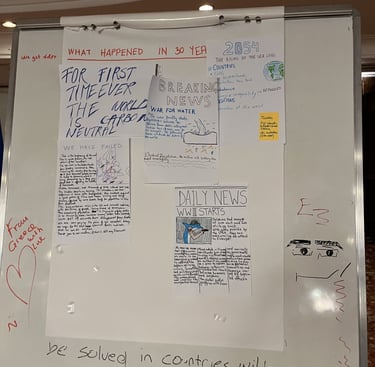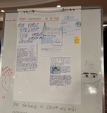 Bir hafta süren bu etkinliğimiz tabi ki sadece toplantılar ve tartışma ortamları olarak ilerlemedi. Yapılan sunumları ve tartışma ortamlarını destekleyen atölyelerle insanların ilgisini canlı tuttuk. Mesela bundan 50-30 yıl sonra Dünya da haber başlıklarının nasıl olacağına dair yaptığımız atölyede su kıtlığında insanlara savaş açan yunuslardan New York etrafına su seviyesi arttığı için duvar ören Amerika’ya kadar değişik fikirler ortaya atıldı.